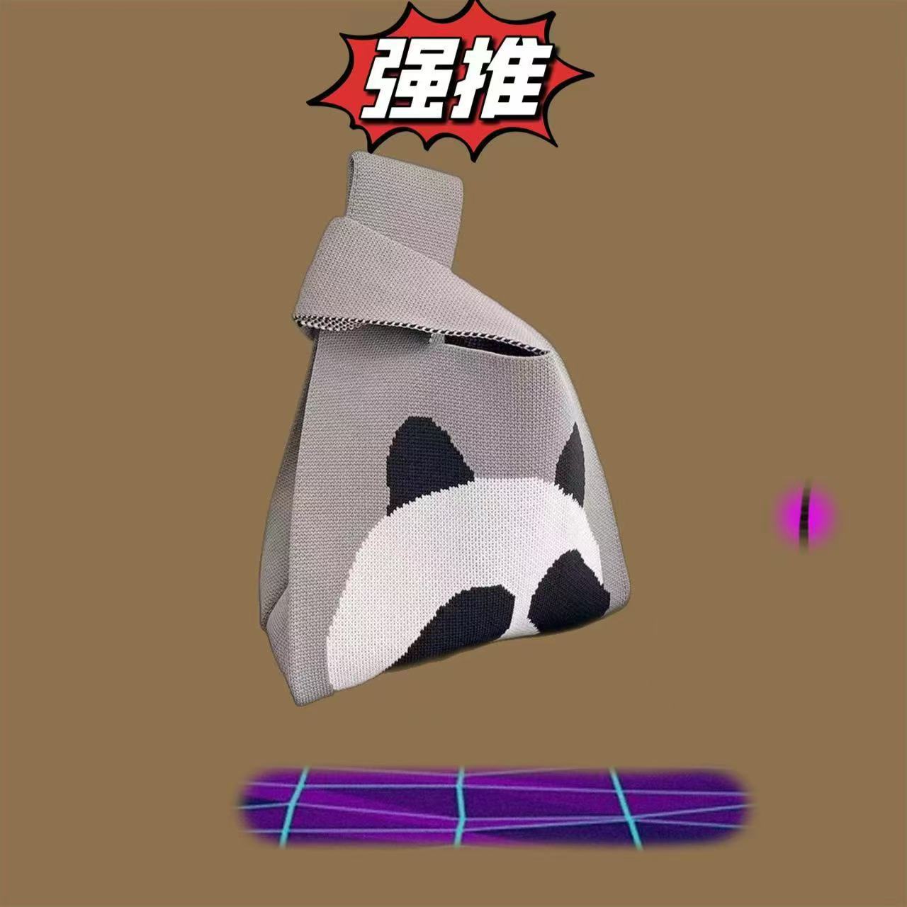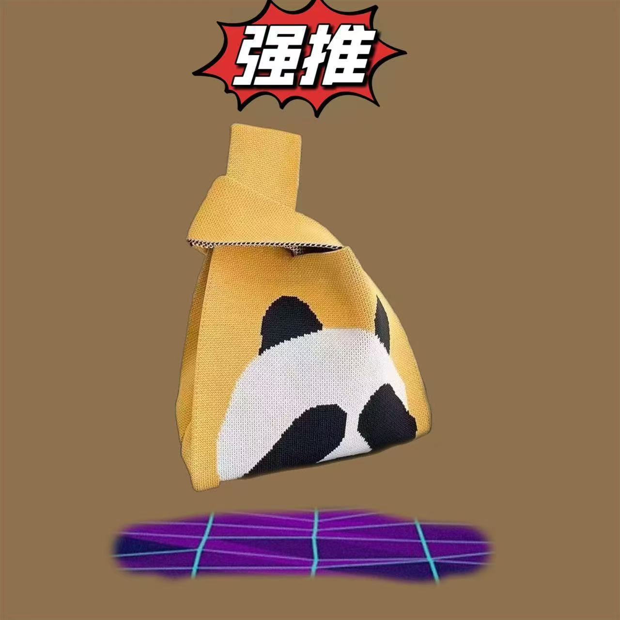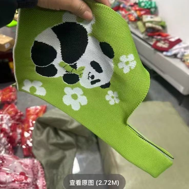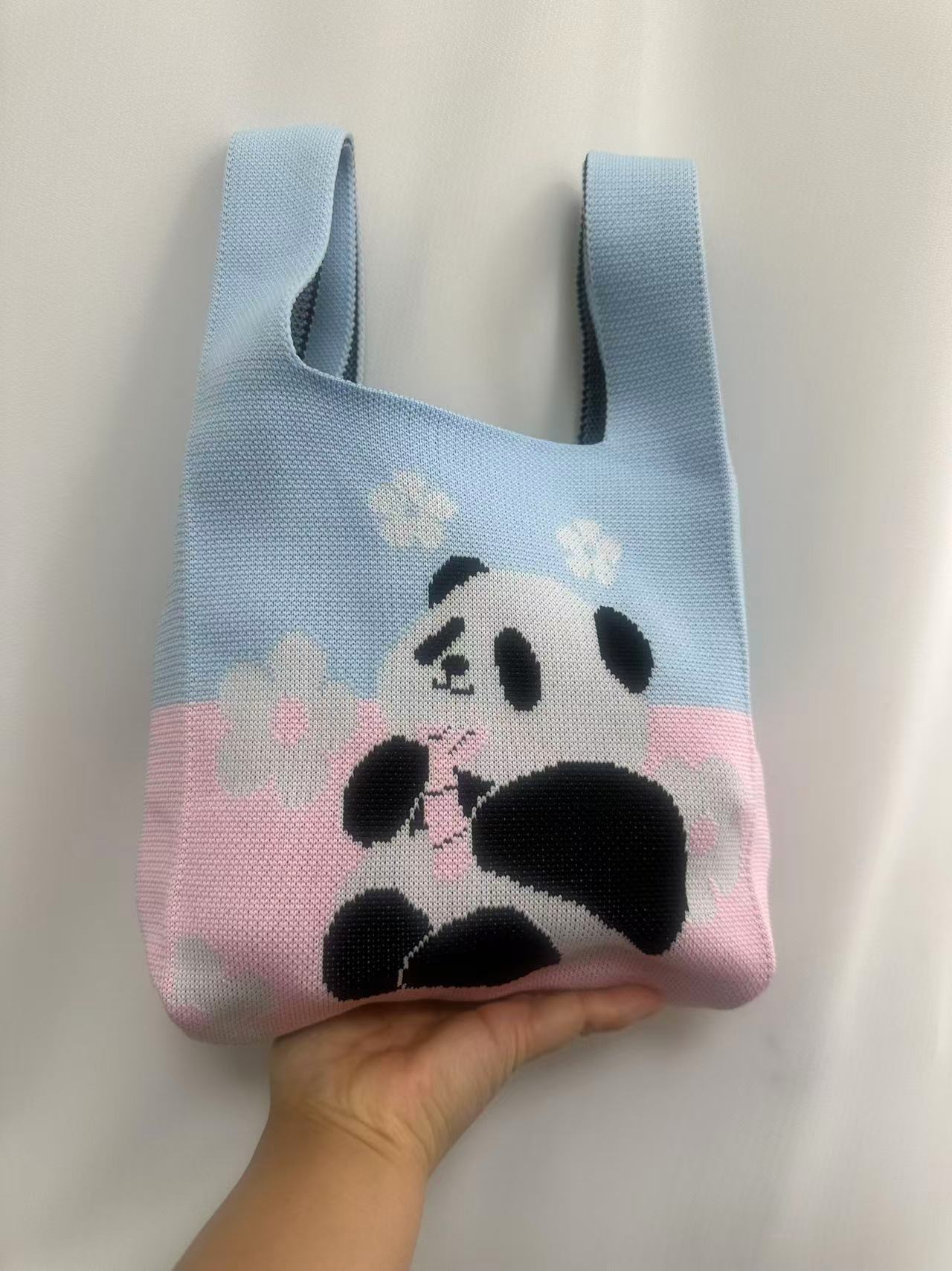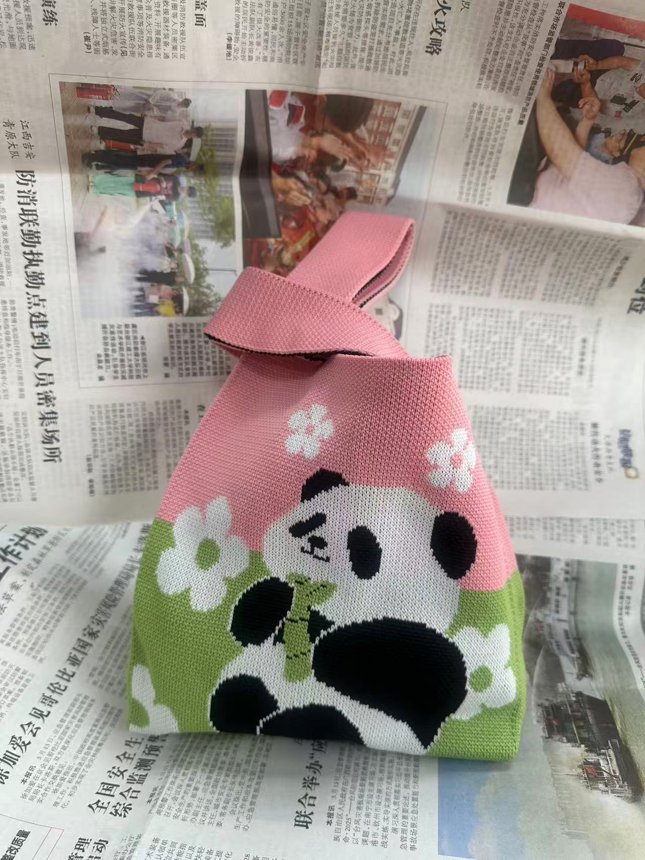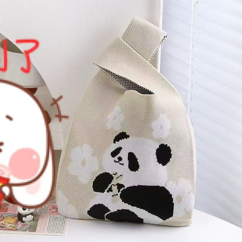 Panda Animal Four Seasons Flower Knitted Bag for Women, Bamboo Bear Handheld Bag, Wrist Bag for Walking and Shopping, Lazy Backpack